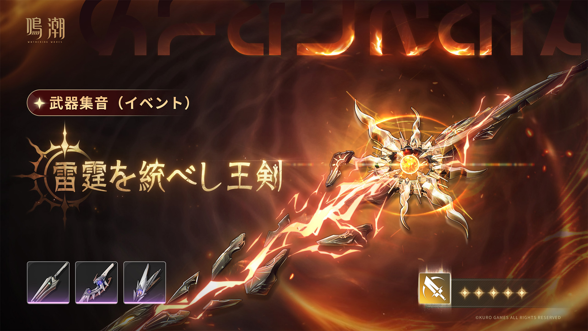 - ピックアップ武器「雷霆を統べし王剣」は、「武器集音(イベント)」のイベントでのみ獲得可能です。イベント終了後の獲得方法につきましては、現在追加する予定はありません。
